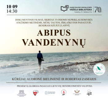 Spalio 9 d. 14.30 val. Kauno rajono savivaldybės viešojoje bibliotekoje, Garliavoje, žiūrėsime dokumentinį filmą „Abipus vandenynų“, pasakojantį apie mūsų tautos, išblaškytos pasaulyje, bendrą kelią į Laisvę. Šis filmas, kurtas Australijoje, JAV ir Lietuvoje, yra skirtas Kovo 11-osios 35-osioms metinėms. Tai pasakojimas apie Laisvės troškulį, atkaklų, nuoseklų, „neišmušamą“ iš maršruto keliavimą į tikslą, nepaisant nieko… dešimtmečius, per tamsą, tremtį, žudynes, bauginimus ir melą, sovietmečio gundymus ir gūdžią tos tikrovės tylą; ir kryptingą veiklą kitapus vandenynų, laisvose „amerikose“, gal niekuomet ir nemačius…
