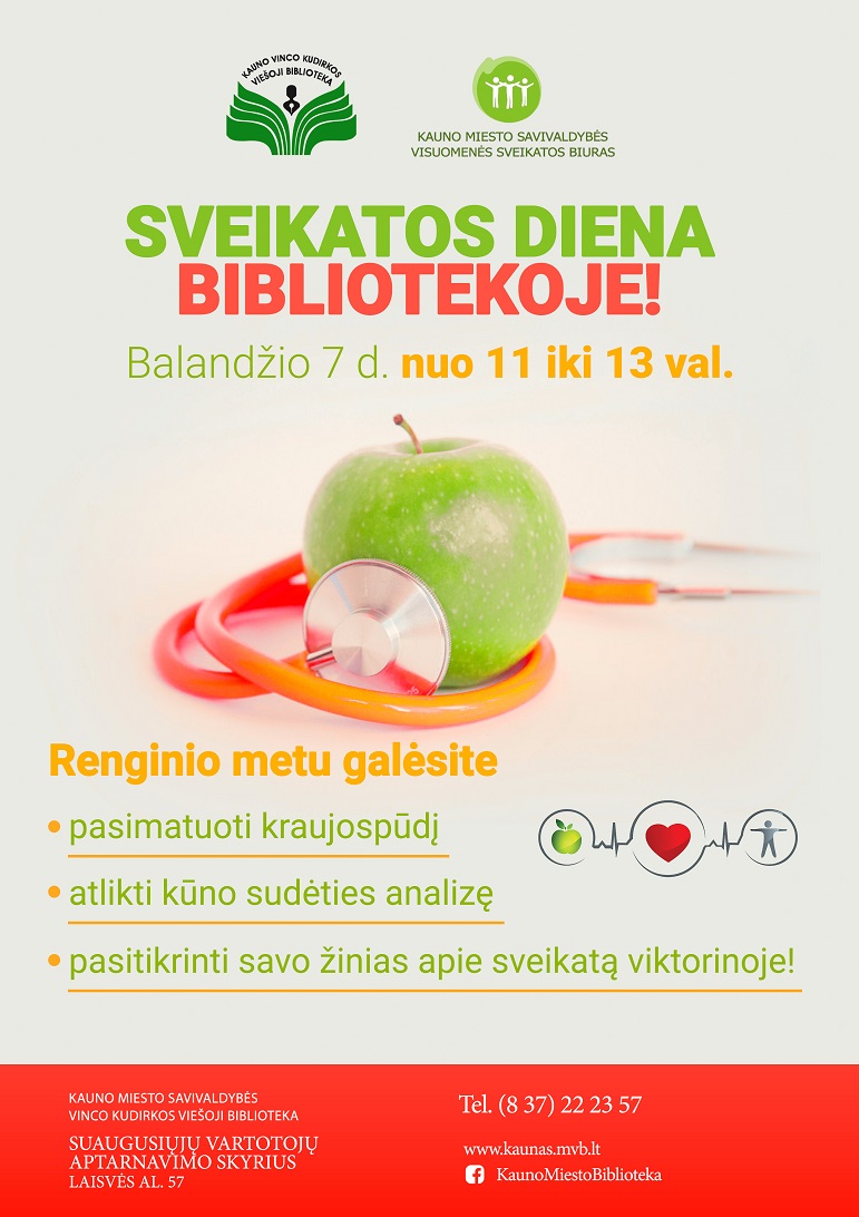 Kauno miesto savivaldybės Vinco Kudirkos viešoji biblioteka kviečia rūpintis savo sveikata ir balandžio 7 d. 11–13 val. užsukti Suaugusiųjų vartotojų aptarnavimo skyrių, esantį Laisvės al. 57.
