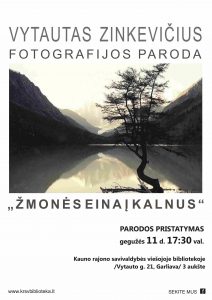 Gegužės 11 dieną Kauno rajono savivaldybės viešojoje bibliotekoje bus pristatyta jurbarkiečio fotografo ir keliautojo Vytauto Zinkevičiaus fotografijos darbų paroda „Žmonės eina į kalnus“. Daugelis gali pasigirti išmaišę Vakarų Europą, bet nedaugelis kalnuose jaučiasi kaip namuose. Fotografas ir keliautojas V. Zinkevičius kalnais domisi nuo 1982 metų ir jau daugiau nei trisdešimt metų iš žygių po kalnus parsiveža įspūdingų nuotraukų. Neįmanoma perduoti to jausmo tiems, kurie nėra buvę kalnuose, tačiau nors dalelė įstabios gamtos grožio užfiksuojama nuotraukose.