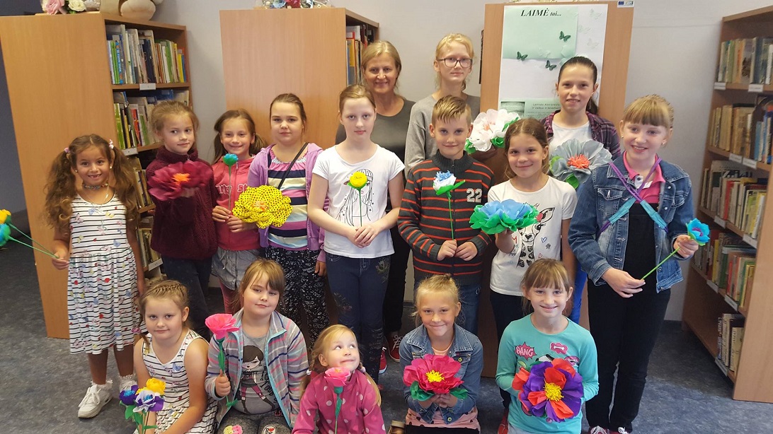 Nors lauke daug žydinčių gėlių, bet savomis rankomis pagamintos gėlės – nepakartojamos. Iš tampomojo popieriaus vaikai gamino savo gėles. Kiekvieno skirtingos, savitų spalvų ir labai mielos. Mokytoja Birūta Pilvelienė padėjo vaikams jas klijuoti, o po kūrybinio darbo arbata dar skanesnė.