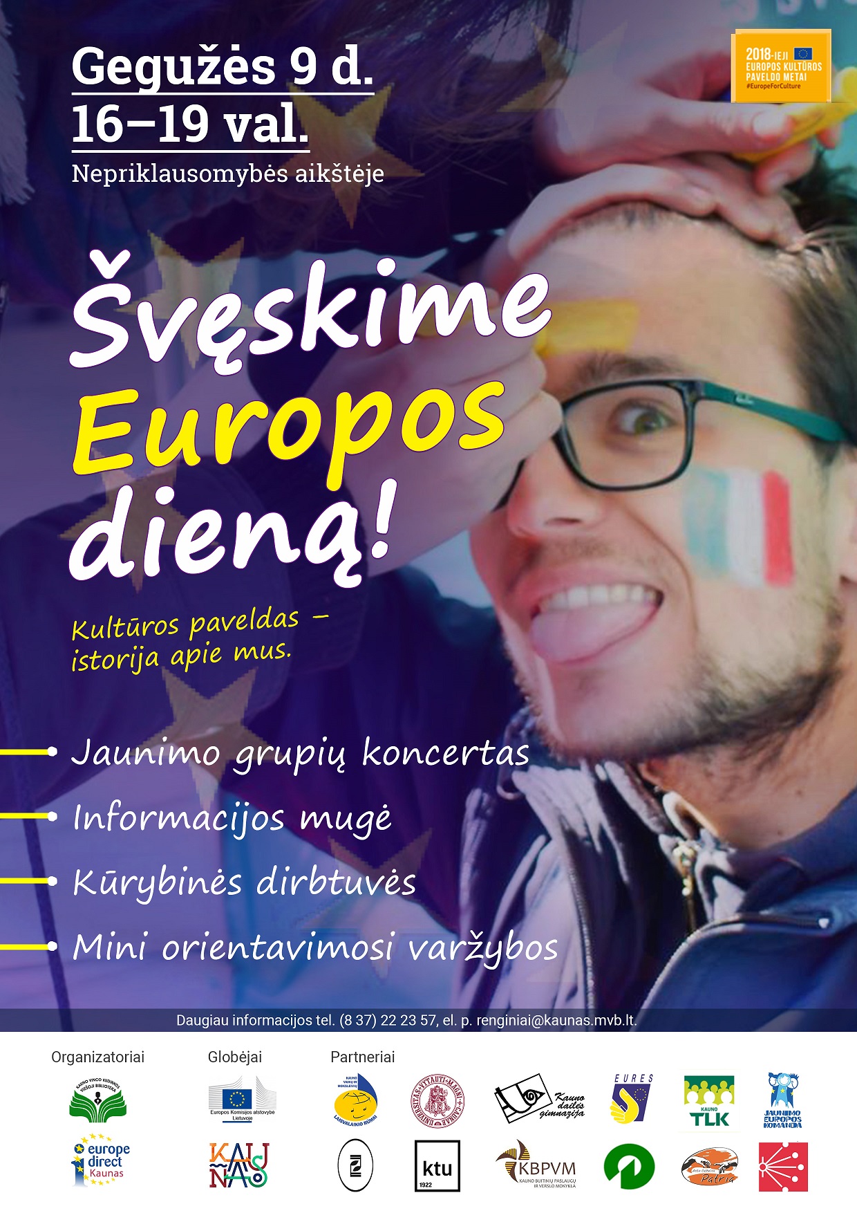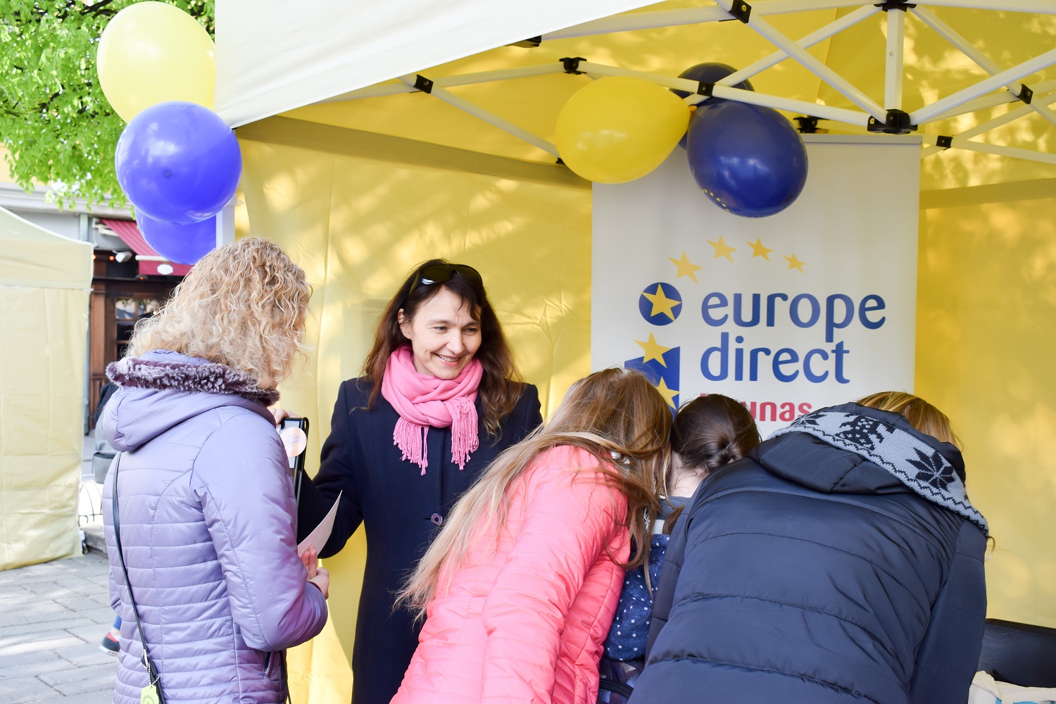 Nuo 16 val. Vienybės aikštėje veiks informacijos mugė, kurios dalyviai teiks informaciją apie Europos piliečių teises bei galimybes, institucijų vykdomas programas, kvies iš arčiau susipažinti su mainų programų savanoriais ar sudalyvauti ruletės žaidime ir pamėginti atsakyti į žaismingus viktorinos klausimus apie Europos Sąjungos valstybes nares. Vytauto Didžiojo universiteto Menų fakulteto studentai kvies susirungti mini orientacinėse varžybose aplankant istorines Kauno Laisvės alėjos vietas bei įamžinti savo sveikinimą europiečiams žaismingu vaizdo įrašu. VšĮ „A.C. Patria“ kartu su Europos Savanorių tarnybos ir programos „Atrask save“ savanoriais kvies pažinti Europą interaktyviai, žaidžiant smagius pažintinius žaidimus. Šventės metu vyks ir kūrybinės dirbtuvės – Kauno buitinių paslaugų ir verslo mokykla kvies pasigaminti žaismingus ženkliukus prisiminimui, o Dailės gimnazija džiugins visus piešiama šventine juosta.