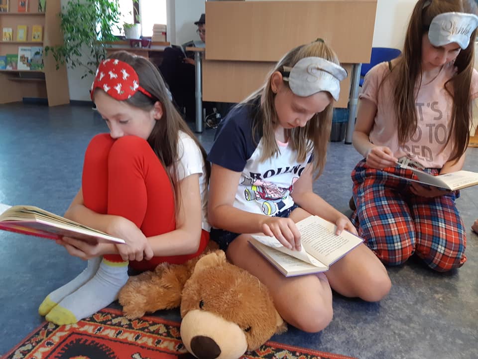 Pižama, šlepetės, gera knyga ir kvapnios žolelių arbatos puodelis.Susitikimą pradėjome skaitymais. Kas skaitė tylomis sau, kam skaitė mamos ar tetos . O po skaitymų – belieka tik pasiskirstyti komandomis ir veikti… atsakyti į viktorinos klausimus, sukurti komandos pavadinimą, nupiešti pačią gražiausią pižamą. O kai šalia būrys draugų, bibliotekos aplinka ir Šeimos šventės svečias Neringa Ašmenaitė – komandinis darbas nugali viską! Į visus klausimus atsakyta. Nugalėjo skaitymas, žaidimai ir buvimas kartu.