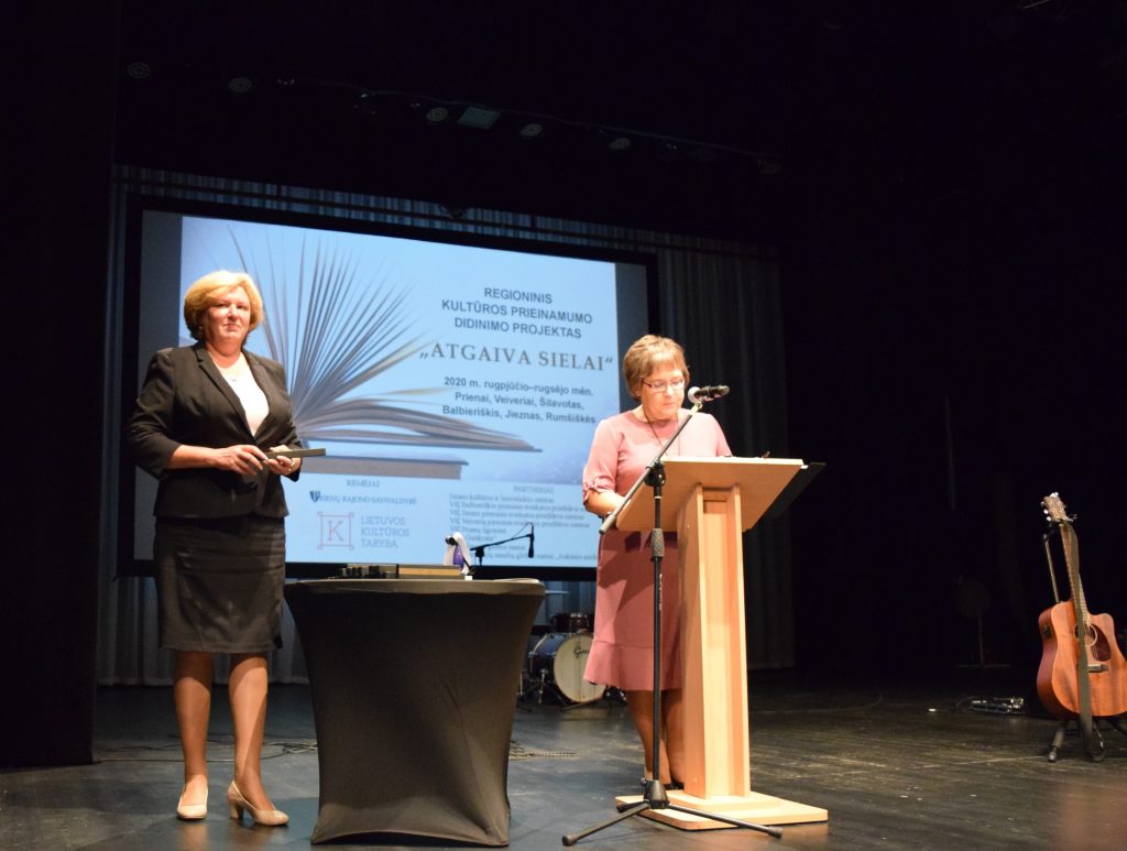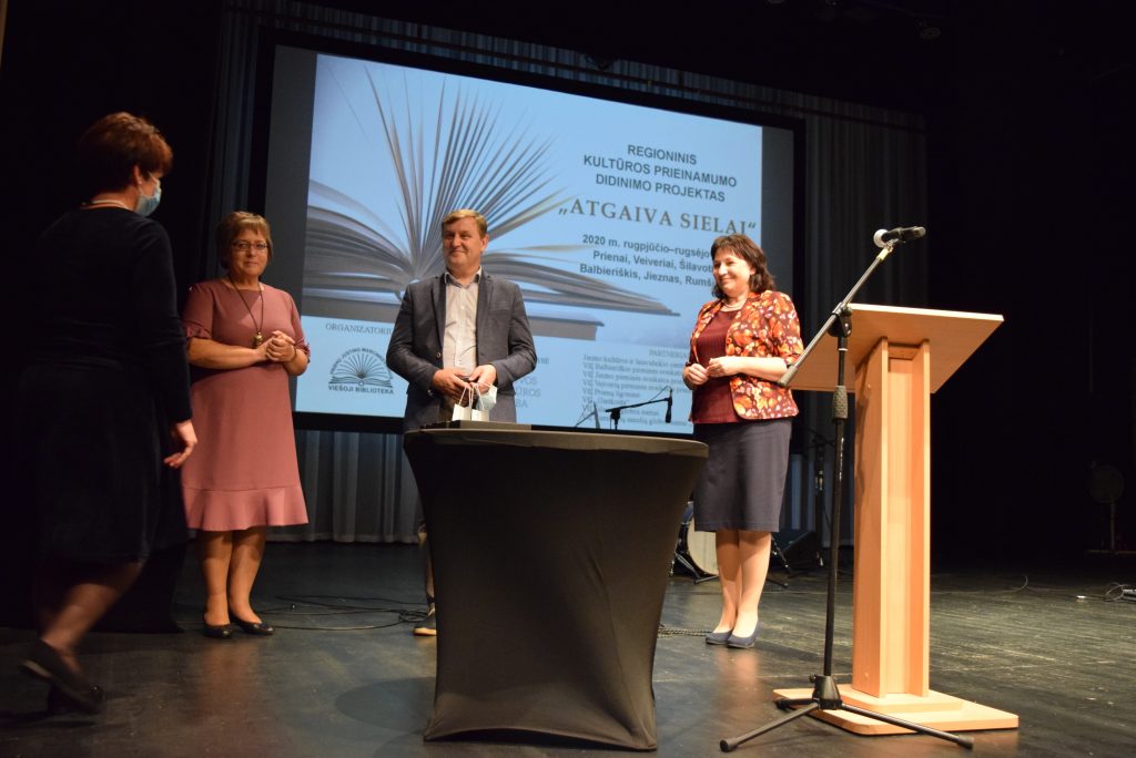 Susirinkusius į renginį pasveikino ir padėkojo už įgyvendintą prasmingą ir labai bendruomenei reikalingą projektą Savivaldybės administracijos direktorė Jūratė Zailskienė. Ji kartu su Kultūros, turizmo ir jaunimo skyriaus vedėju atminimo dovanas įteikė Prienų Justino Marcinkevičiaus viešosios bibliotekos Jiezno ir Kašonių bibliotekų bibliotekininkėms Vilmai Trabuševskienei ir Danutei Bajorienei, kurioms renginio metu buvo perduoti Lietuvos Respublikos kultūros ministro ir Lietuvos savivaldybių viešųjų bibliotekų asociacijos padėkos raštai. Jiezno bibliotekos bibliotekininkei buvo įteiktas padėkos raštas už viešųjų bibliotekų veiklos efektyvumo didinimą, inovatyvių paslaugų plėtrą, bibliotekininkų bendruomenės telkimą, bibliotekos, kaip reikšmingos institucijos, užtikrinančios žinių visuomenės kūrimąsi, įvaizdžio formavimą, Kašonių bibliotekai, pripažintai „Bendruomeniškiausia biblioteka 2019“, už įvairiapusišką veiklą ir iniciatyvas telkiant miestelio/kaimo bendruomenę, bendradarbiavimą su kitomis joje veikiančiomis institucijomis ir organizacijomis.