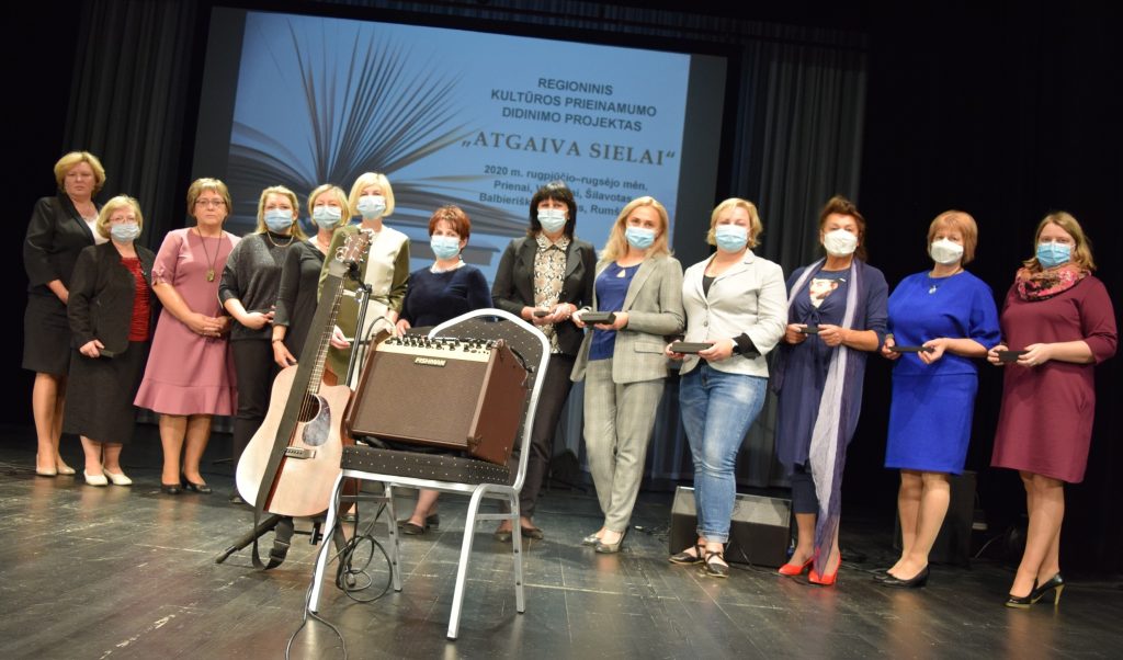 Prienų Justino Marcinkevičiaus viešosios bibliotekos direktorė Daiva Čepeliauskienė, pristatydama projekto rezultatus, padėkojo ir įteikė atminimo dovanėles projekto partneriams, kurie labai aktyviai ir nuoširdžiai įsijungė į projekto veiklas, suprato ir skatino tęsti bibliotekos pradėtą iniciatyvą skleisti kultūrą slaugos ir palaikomojo gydymo skyriuose, senelių globos namuose, bei projektą įgyvendinusiai bibliotekos darbuotojų komandai.