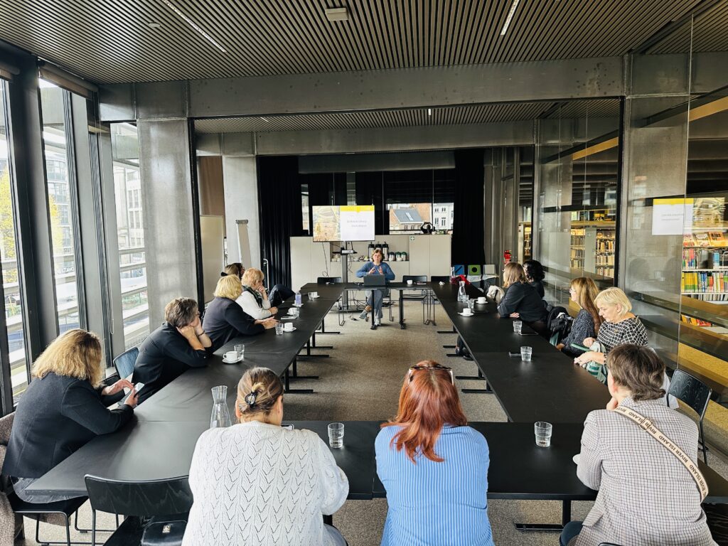 Vizito metu šioje bibliotekoje pristatėme ir Lietuvos viešųjų bibliotekų teikiamas paslaugas, vykdomas veiklas ir Kauno regiono viešųjų bibliotekų įdomesnes patirtis. Smagu buvo pasidalinti patirtimi apie Jonavos Grigorijaus Kanovičiaus viešosios bibliotekos Knygų terasą ir pristatyti interaktyvią autobusų stotelę. Belgijos kolegoms buvo įdomu sužinoti apie mūsų tinklo struktūrą, regioninį bendradarbiavimą bei bibliotekų vaidmenį mažesniuose miestuose.