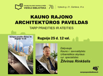 Rugsėjo 25 d., ketvirtadienį, 12.00 val.Kauno rajono savivaldybės viešoji biblioteka,Vytauto g. 21, Garliava◘ Kokiais išskirtiniais traukos objektais pagrįstai gali didžiuotis Kauno rajono seniūnijos ir kuo jie išsiskiria bendrame kontekste?◘ Daug įdomybių apie Kauno rajono architektūros paveldą sužinosite atvykę į Kauno rajono savivaldybės viešąją biblioteką Garliavoje pasiklausyti paveldosaugininko Žilvino Rinkšelio pranešimo „Kauno rajono architektūros paveldas – tarp praeities ir ateities“ bei užduoti rūpimų klausimų.◘ Renginys nemokamas. Bibliotekoje esate visuomet laukiami ♥◘ Renginys skirtas Europos paveldo dienoms paminėti.◘ Renginio nuoroda FB: https://fb.me/e/5kKGyyebd…